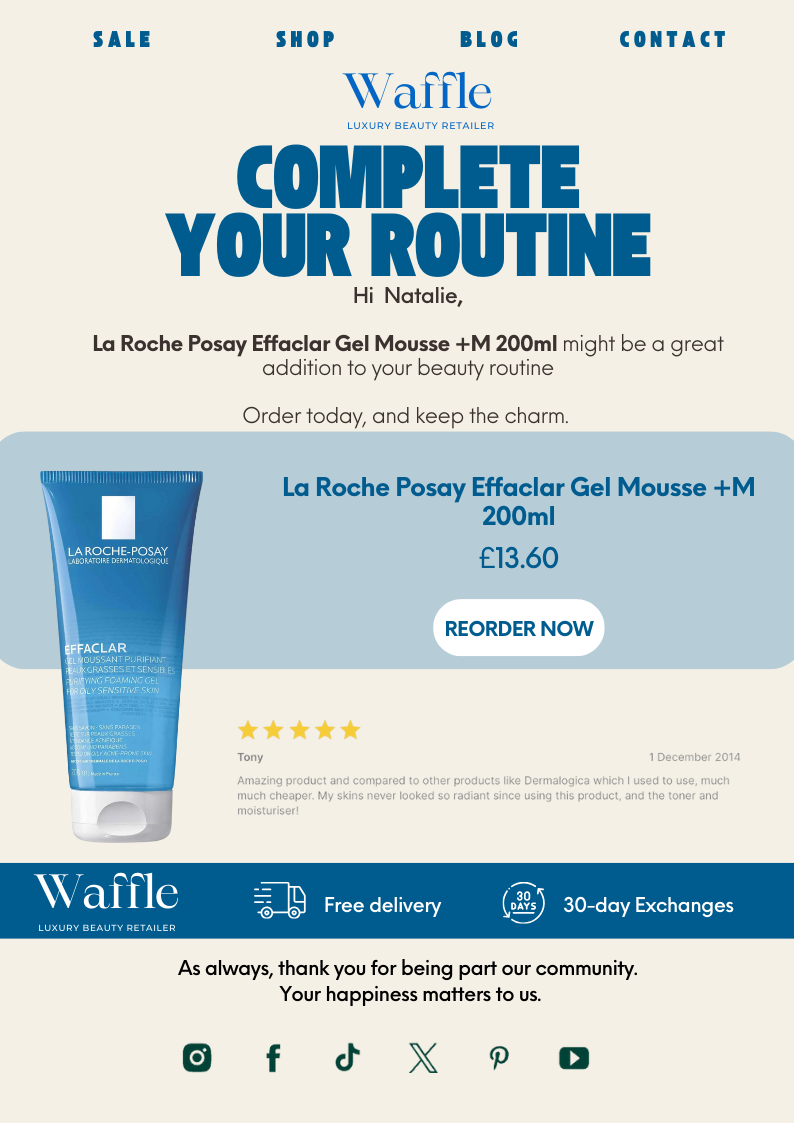 Stop random cross sell attempts. Replenit's AI identifies the perfect moment to suggest complementary products and adds a reasoning layer that explains why products pair together: building routines, enhancing experiences, or completing sets.