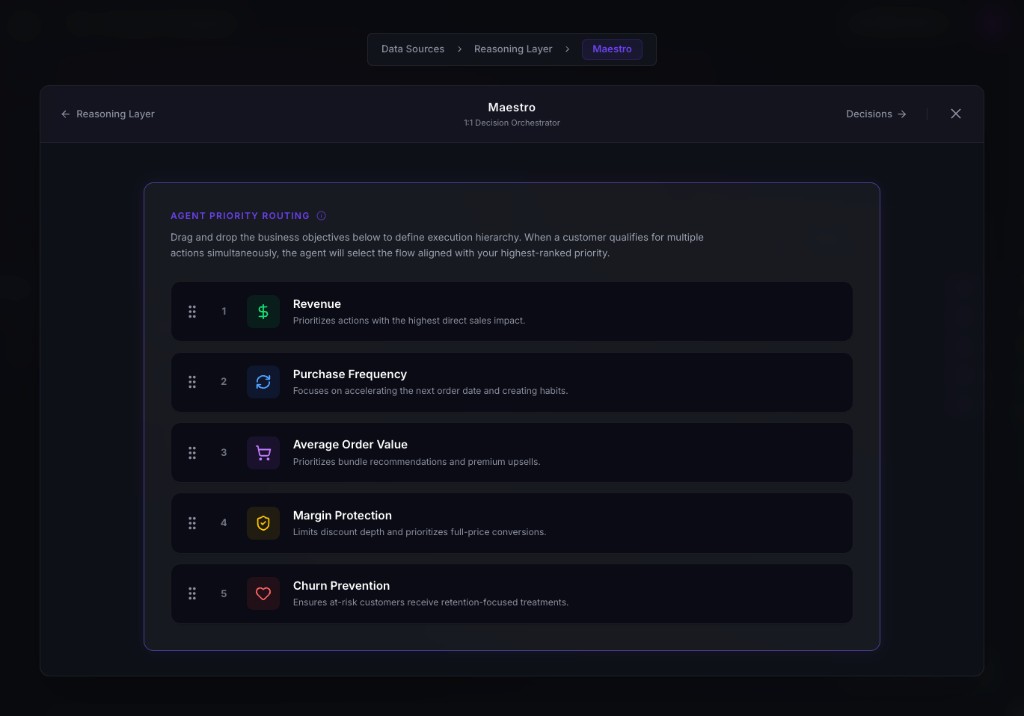 Maestro is where your team controls the AI CRM Manager. Define the business goal, reward logic, and guardrails — and the AI manages the rest across every customer in your Bloomreach setup.