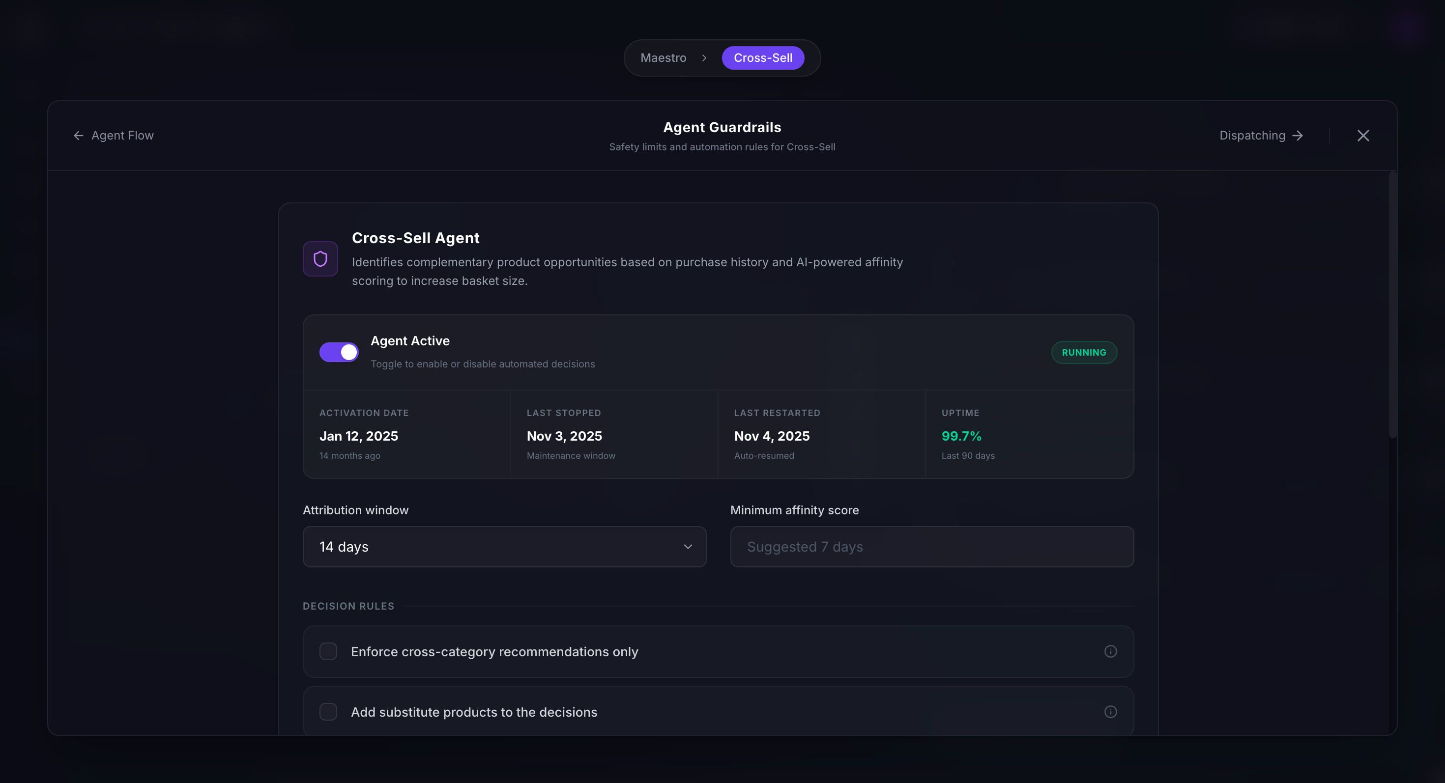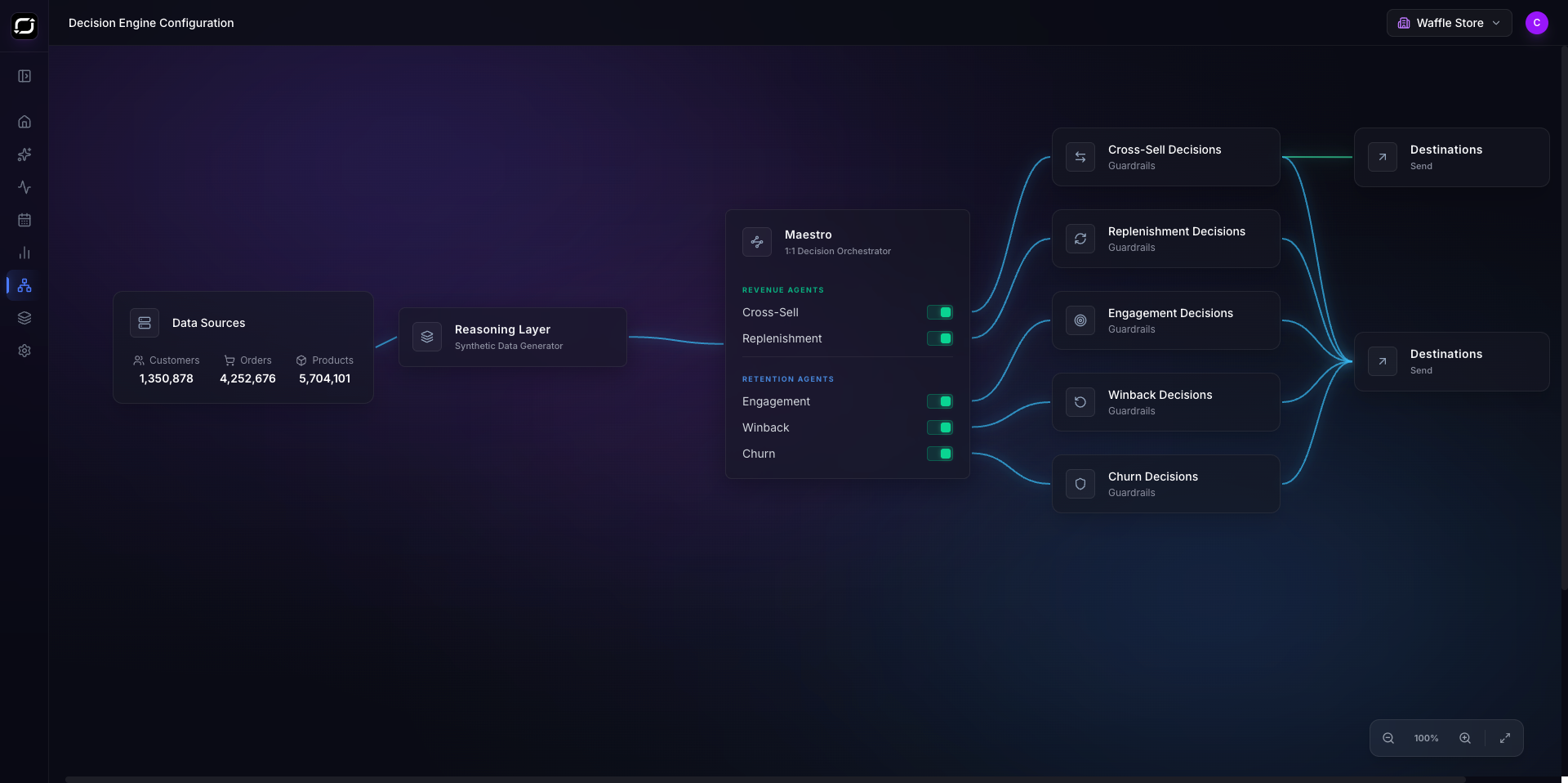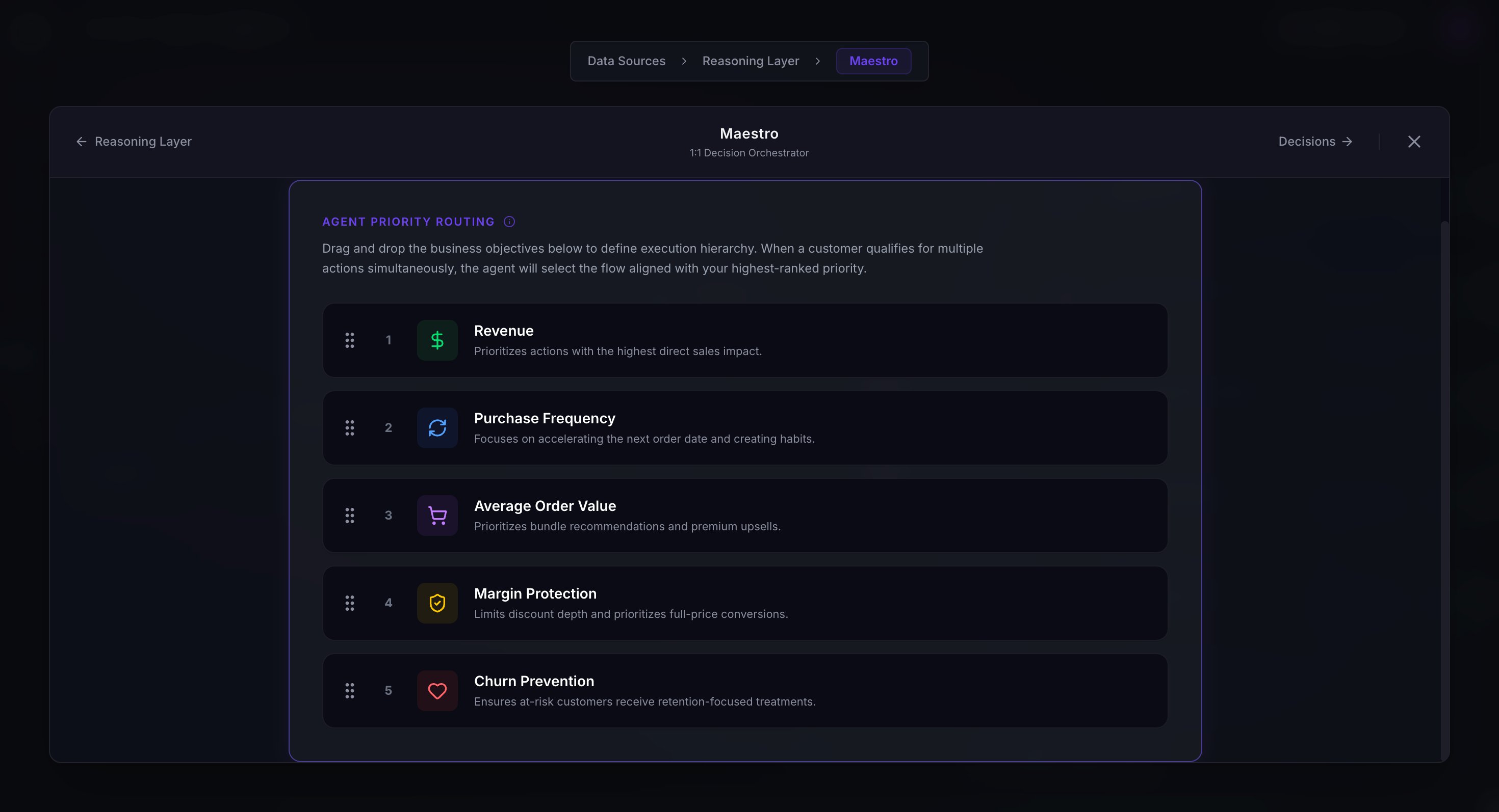 Define your strategic priorities: revenue, purchase frequency, AOV, margin protection, churn prevention. Maestro translates them into real-time agent directives.