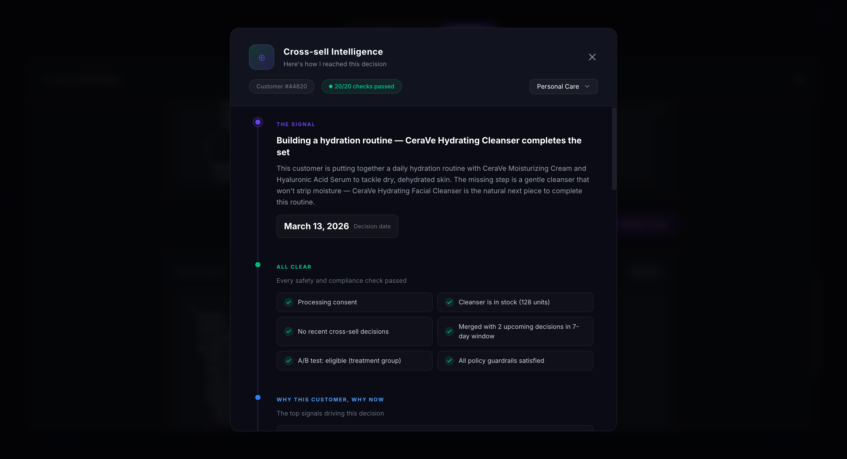 No segments, no manual rules. Each decision is unique, driven by real-time customer intelligence and your strategic priorities.